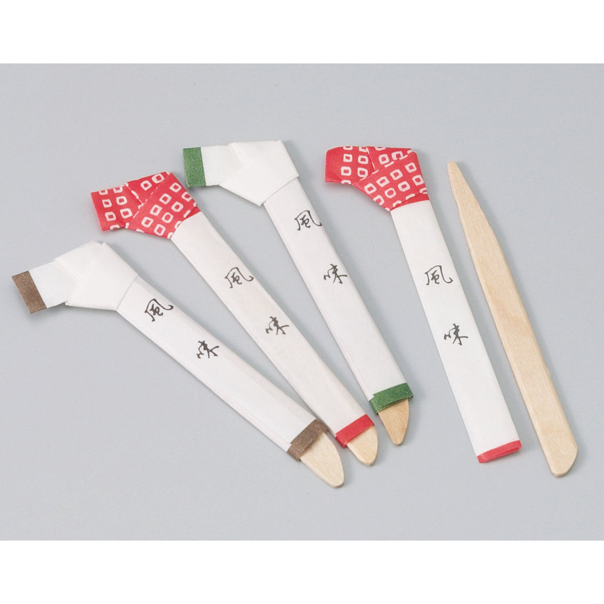 三つ折の結び加工を施した袋に入れた菓子楊枝です。